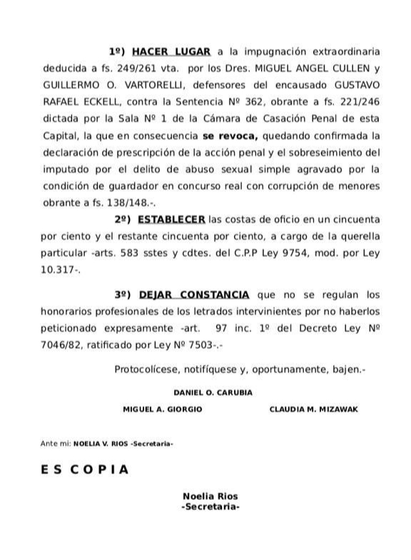 Finalmente, la causa se dio por prescripta en agosto de 2019 porque los abusos datarían de al menos 15 años, aunque en los argumentos la Justicia habla de una víctima, como confirmando que los hechos denunciados efectivamente ocurrieron.