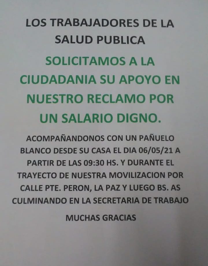 Además, solicitan a la ciudadanía el apoyo con un pañuelo blanco desde ventanas, balcones y vehículos, acompañando la marcha, a modo de otorgarle mayor visibilidad.