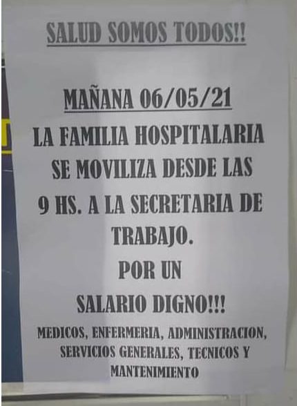 La convocatoria es realizada por médicos, personal de enfermería, administración, servicios generales, técnicos y mantenimiento, ya que todos se ven afectados por el grave atraso salarial.
