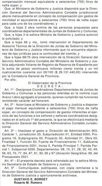 Por otra parte, se les pagará el equivalente mensual a 700 litros de nafta súper, según se publicó en el Boletín Oficial, ya que el cargo supuestamente es ad honorem.