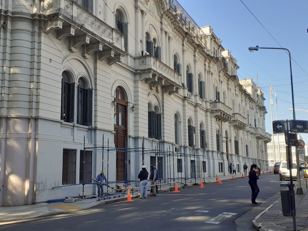 Los trabajos de 46 millones de pesos licitados en noviembre se realizan sobre la fachada de Casa de Gobierno que da a calle Córdoba, aunque el resto de la construcción está parada.