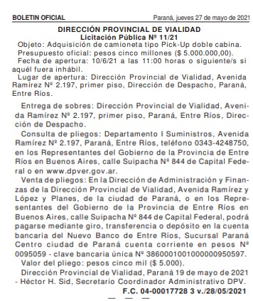 La Dirección Provincial de Vialidad llamó a una licitación pública para comprar una camioneta “tipo Pick Up doble cabina” con un presupuesto de cinco millones de pesos, según se publicó en el Boletín Oficial de la provincia.