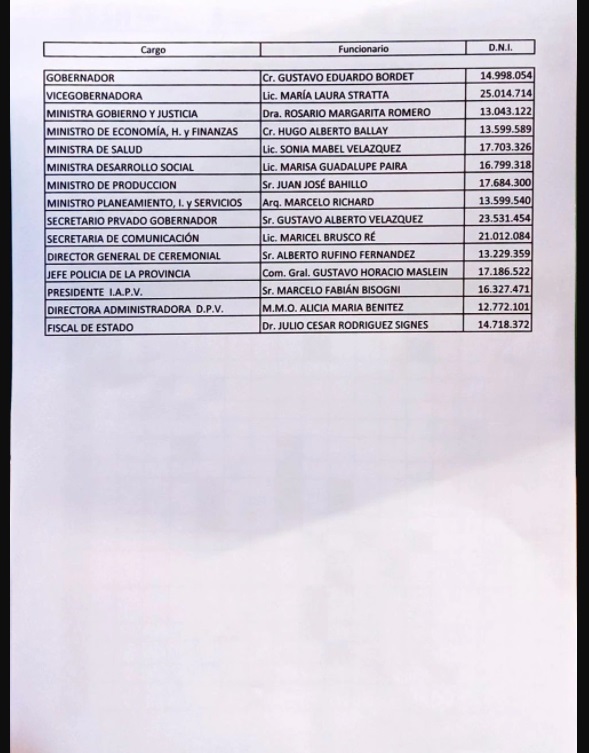Fiel al negacionismo sistemático con el que se maneja esta gestión, aparece solo el nombre del gobernador y del gabinete, pero faltan los esposos y esposas, diputados, y senadores, familiares y amigos, y una gran cantidad de menos de 30 años.
