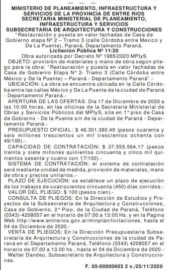 Cuando el gobierno provincial publicó el llamado a licitación en el Boletín Oficial, en noviembre del año pasado, el presupuesto de la obra era de 46.301.380,49 pesos.