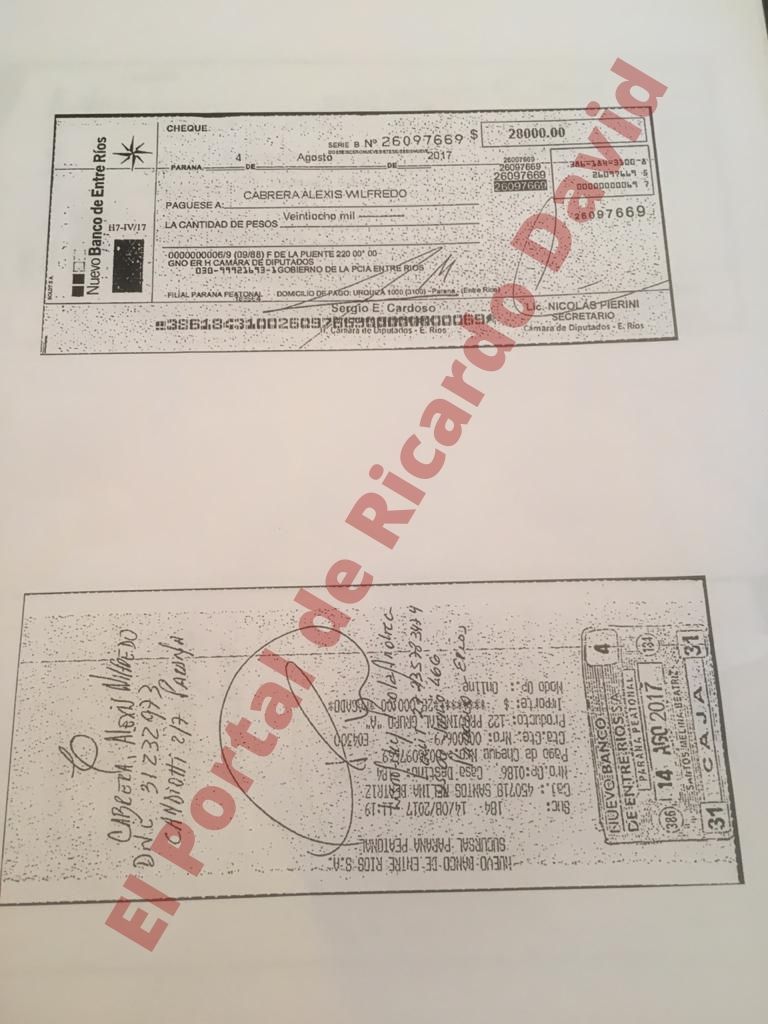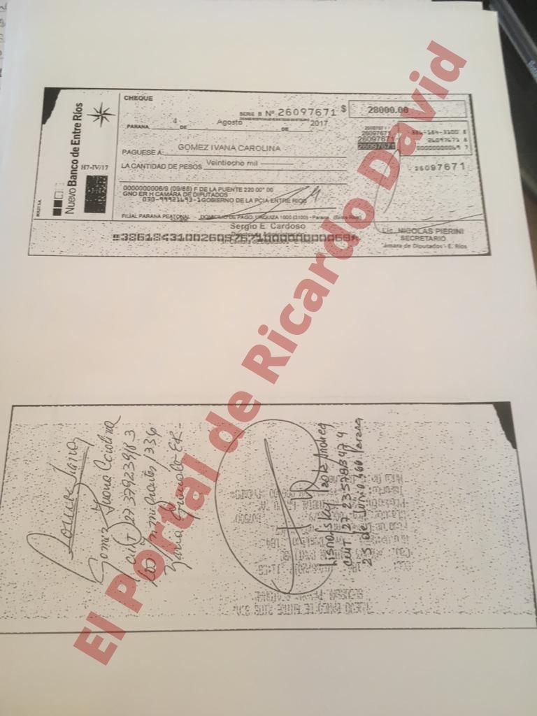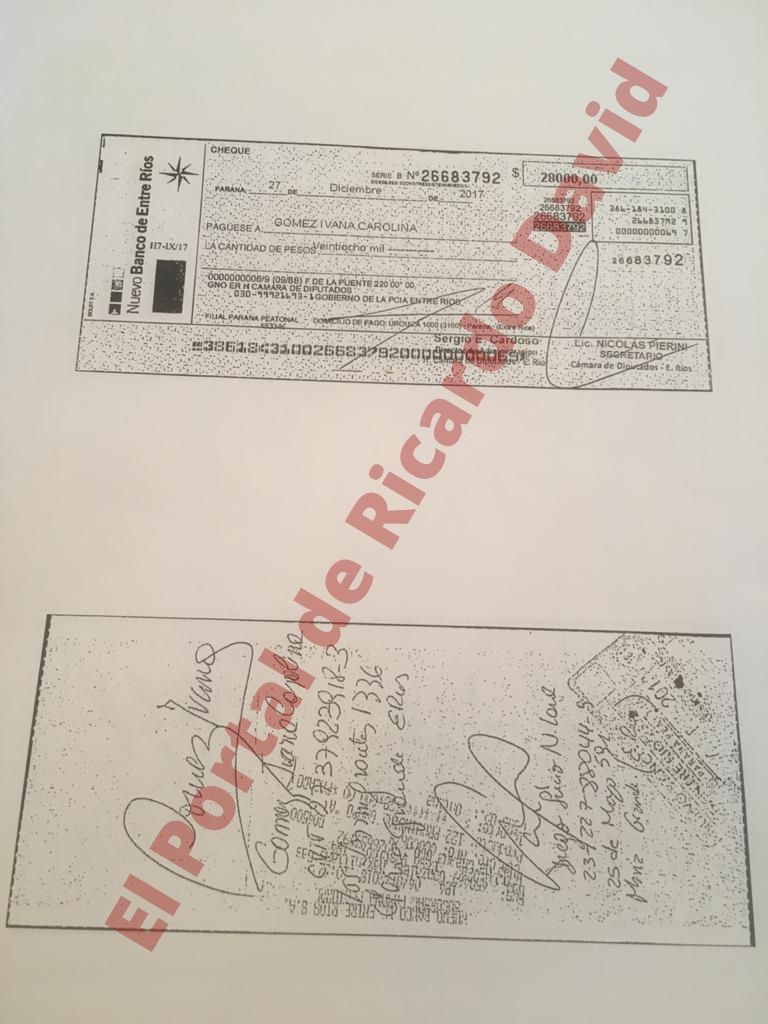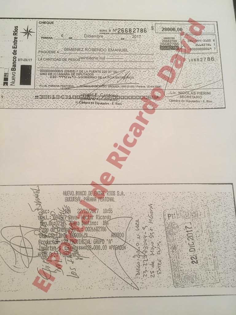 Lara cobró los cheques a nombre de Rosendo Emanuel Giménez, uno por 28000 pesos, 1800 dólares de ese momento, el 22 de diciembre de 2017.