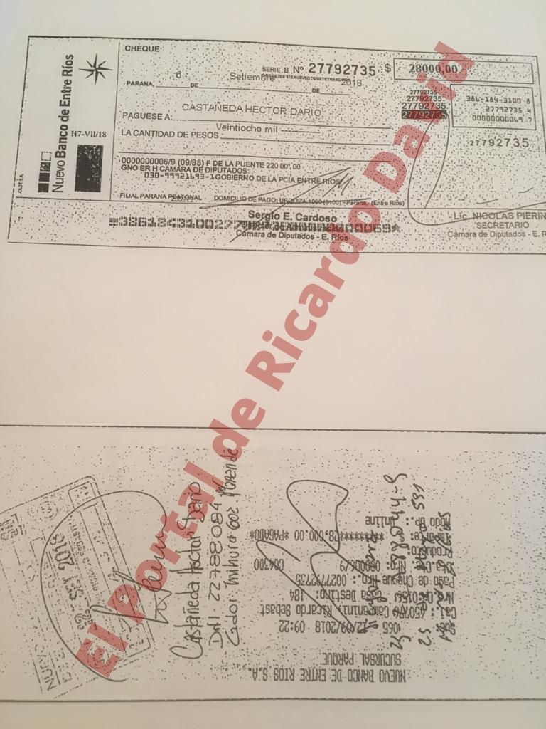 Dos días después, el 12 de septiembre, Lara volvió al banco, en esa oportunidad con un cheque por 28 mil pesos, más de mil dólares, a nombre de Héctor Darío Castañeda, que aparece en otras oportunidades.