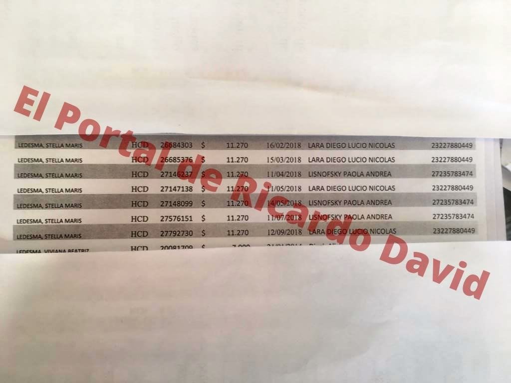 En cuanto a la pareja de Lara, Paola Lisnofsky, cobró, entre otros cientos a nombre de Gómez Ivana Carolina, uno por 28000 pesos, casi 2000 dólares a la fecha, el 4 de agosto de 2017; y otro a nombre de Alexis Wilfredo Cabrera, diez días después, por otros 28 mil pesos.
