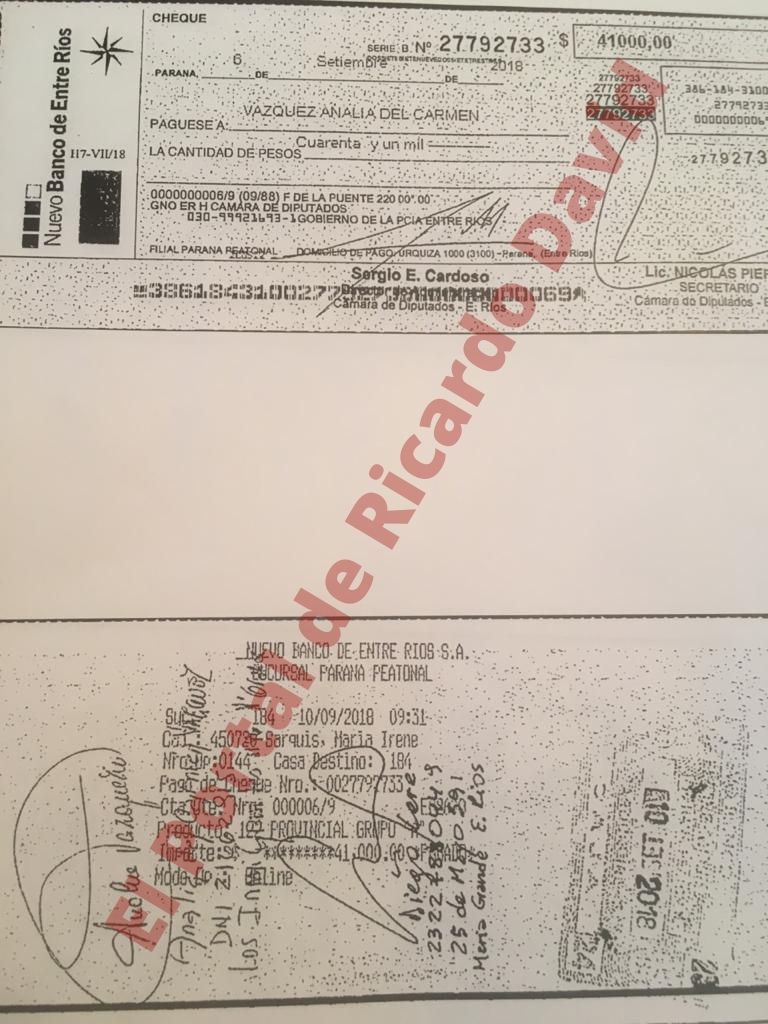 Otro de los nombres que aparecen es el de Analía del Carmen Vázquez, y el 10 de septiembre de 2018, el ex diputado cobró un cheque de por 41 mil pesos, 1560 dólares en aquel entonces.
