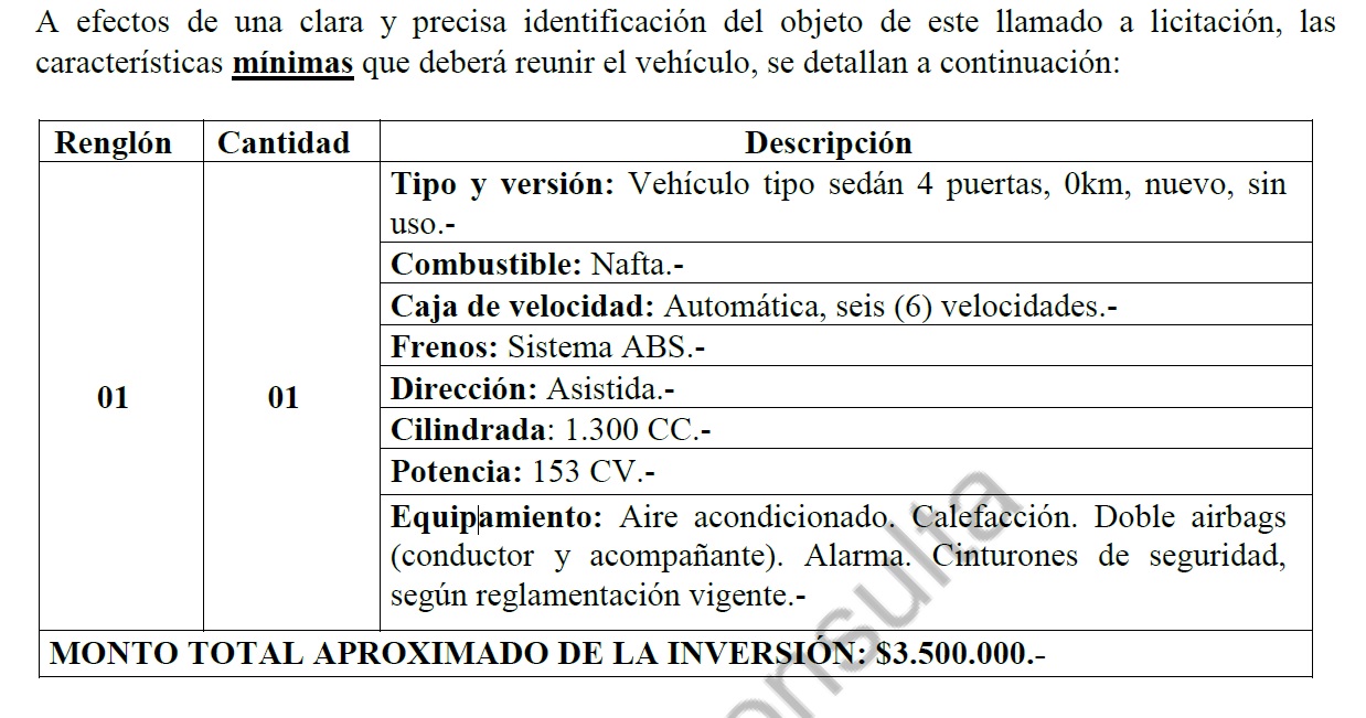 Esta secretaría, cuyo titular es el contador Antonio Labriola, requiere “un vehículo tipo sedán 4 puertas, 0km, nuevo, sin uso”, según consta en el pliego de condiciones generales de la Licitación Pública N°17/21.
