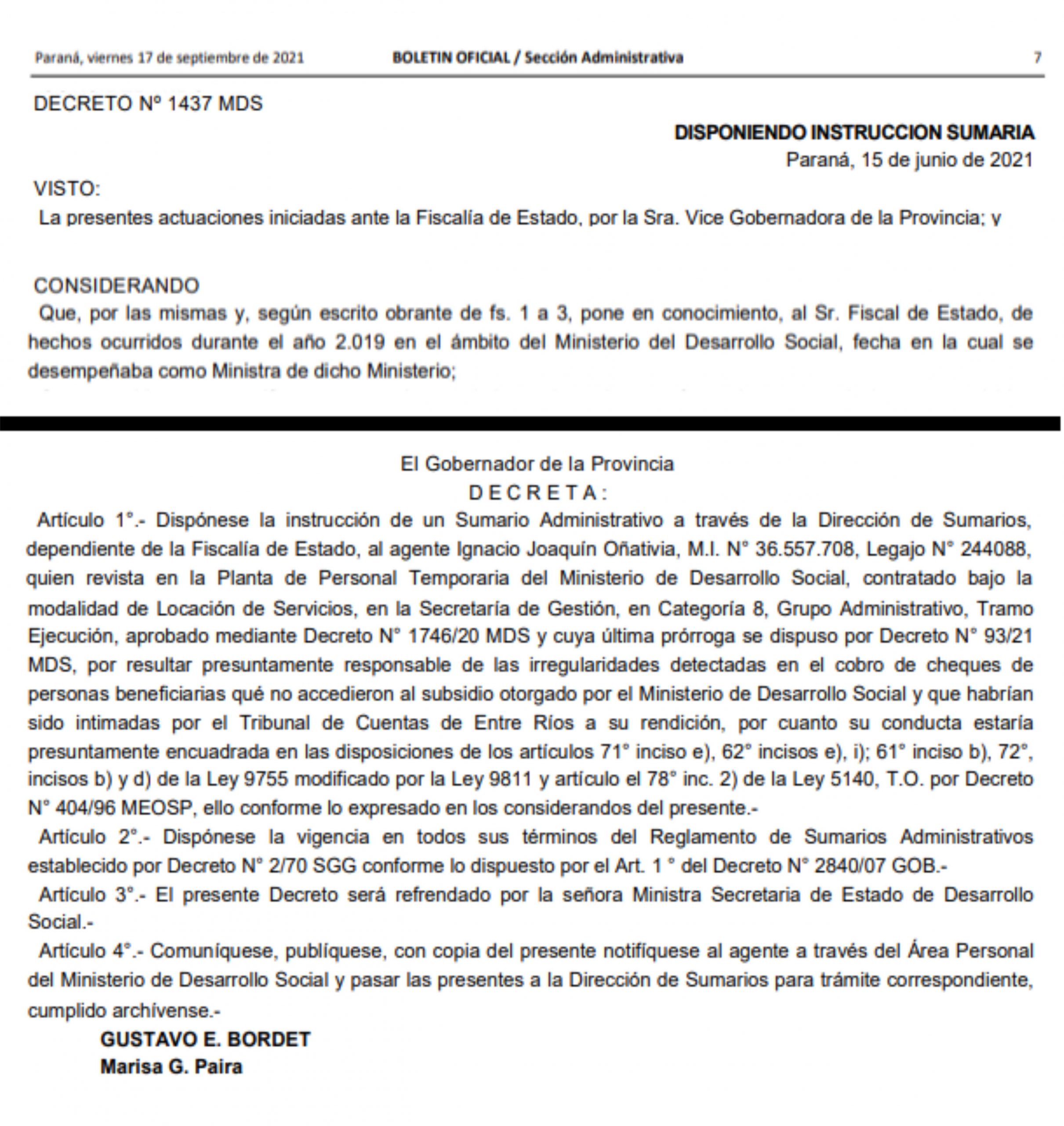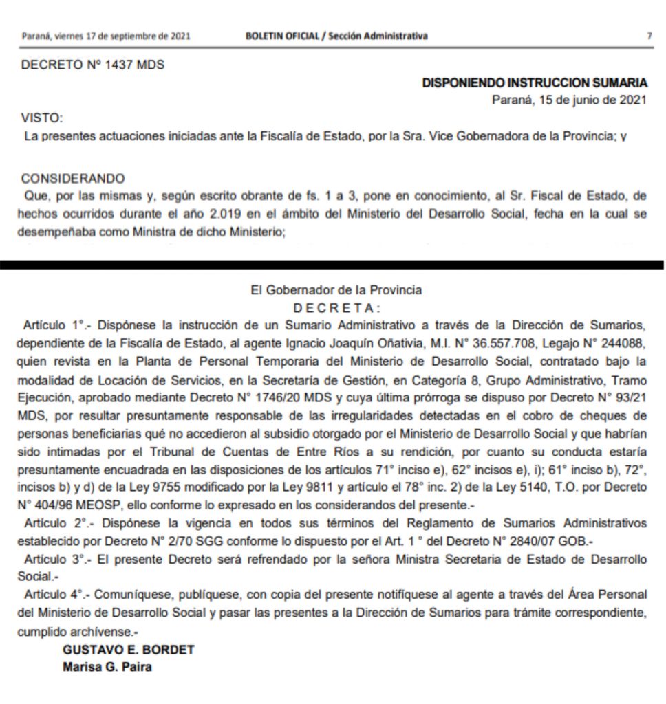 En caso de ser una mera falta administrativa, será suficiente el sumario al Señor Oñativia y se desligará de culpa y cargo a la actual Vicegobernadora. Por la salud de las Instituciones Entrerrianas actúen de oficio y revelen la verdad de lo acontecido.