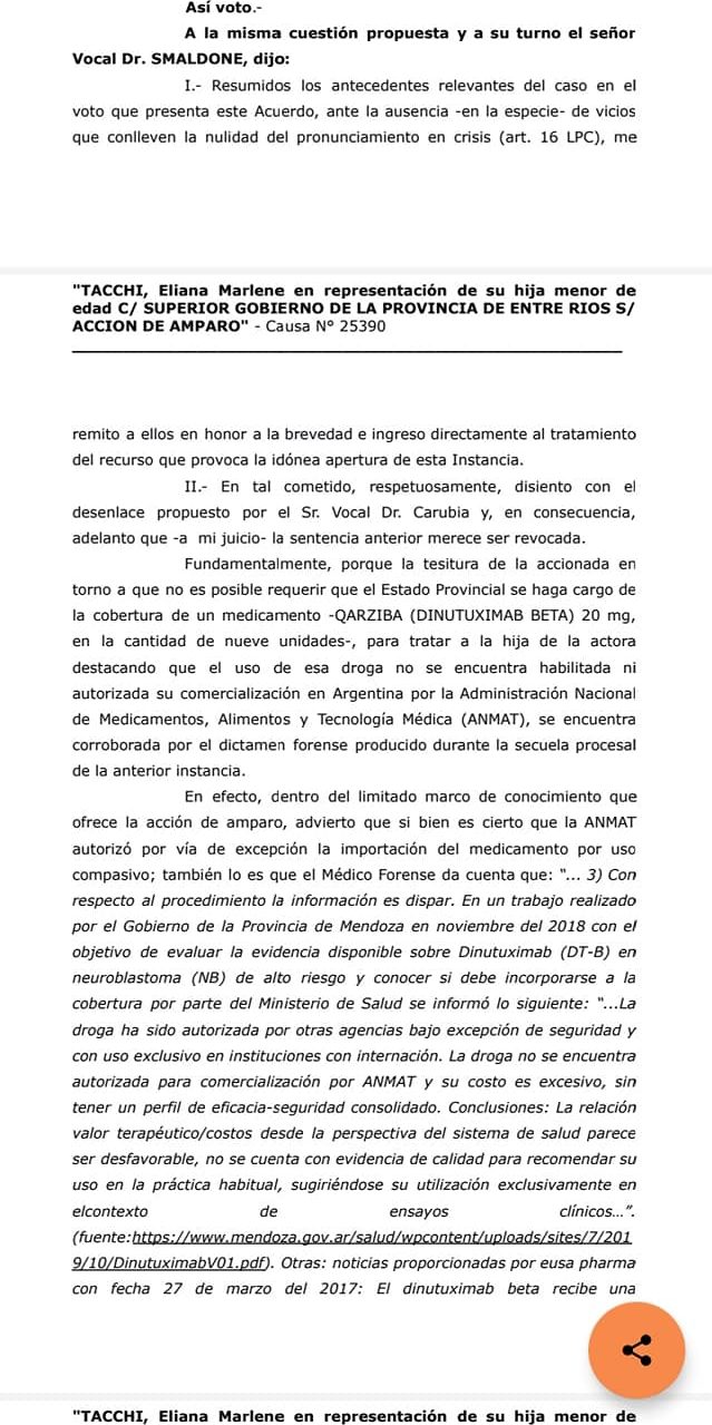 «La provincia de Entre Ríos se niega a la compra del medicamento Dinutuximab Beta Qarziba. En primera instancia la sentencia de la justicia fue a favor de Sofía pero la provincia de Entre Ríos apeló la sentencia y una vez más se negó a la compra del medicamento», detalló Eliana, la mamá de Sofía.