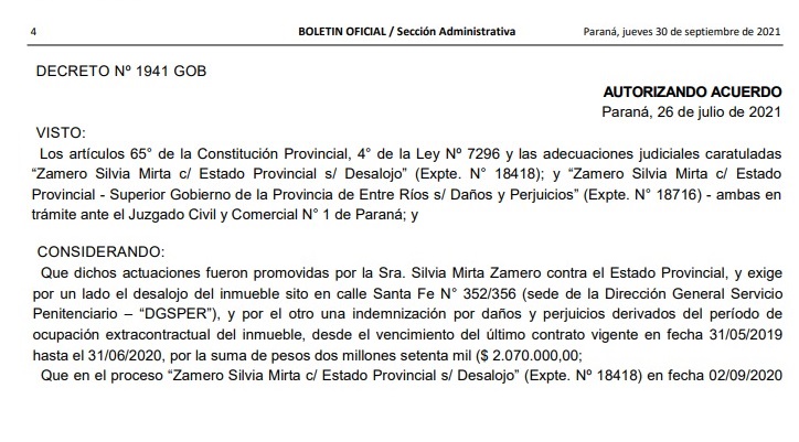 Parecería que desde el Ministerio de Gobierno no se llevaron adelante las gestiones en tiempo y forma para el pago del alquiler de la oficina ubicada en calle Santa Fe donde funciona la Dirección del Servicio Penitenciario. La propietaria, luego de varias cartas documento intimando el pago, se vio obligada a iniciar el juicio, en el que además de reclamar los alquileres caídos, reclama los daños y perjuicios.