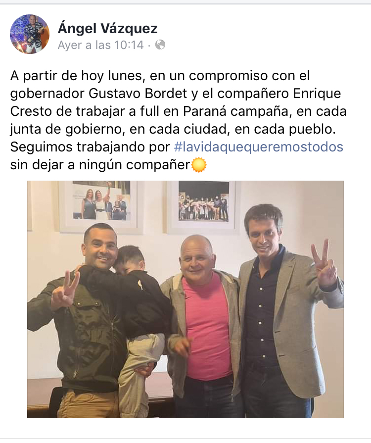 Quien no fue ajeno a esta nueva forma de militar fue el histórico militante Ángel Vázquez, ex intendente de San Benito, luego diputado provincial y ahora Coordinador de Producción del Paraná, que utilizando su red social Facebook se manifestó –luego del día de la lealtad – diciendo que “Hoy lunes, en un compromiso con el gobernador Gustavo Bordet y el compañero Cresto de trabajar a full en Paraná Campaña, en cada junta de gobierno, en cada ciudad y en cada pueblo.” Y agrega ”seguimos trabajando por #lavidaquequeremostodos sin dejar afuera a ningún compañero.”
