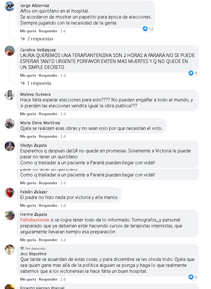 Los victorienses estallaron en las redes sociales ante tal anuncio de la jefa de campaña en Victoria que no tuvo mejor idea que realizar el anuncio, mostrar el decreto, pero no aclarar que las obras no llegarán en mucho tiempo. Por esto se comunicaron con este Portal para plantear su malestar y se conozca en toda la provincia.