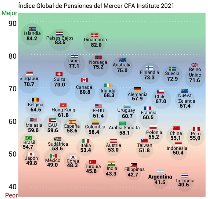 La Argentina tiene el segundo peor sistema previsional sobre una lista de 43 países que abarcan al 65% de la población mundial, según el “Global Pension Index 2021″ compilado por el Mercer CFA Institute. El único de los 43 países con un puntaje inferior al de la Argentina incluidos en este índice Global sobre la calidad de los sistemas jubilatorios es Tailandia.