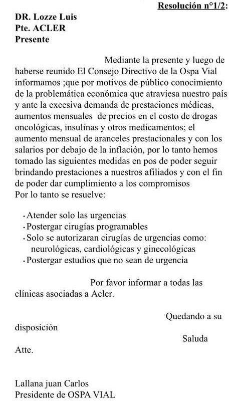 En una misiva enviada a la Asociación de Clínicas de Entre Ríos, el presidente de la OSPA VIAL, Juan Carlos Lallana, pidió a la entidad que solo atienda «urgencias» de los afiliados, debido a que «por la excesiva demanda de prestaciones médicas y el aumento mensual de los costos de medicamentos oncológicos», no van a poder atender más que urgencias.
