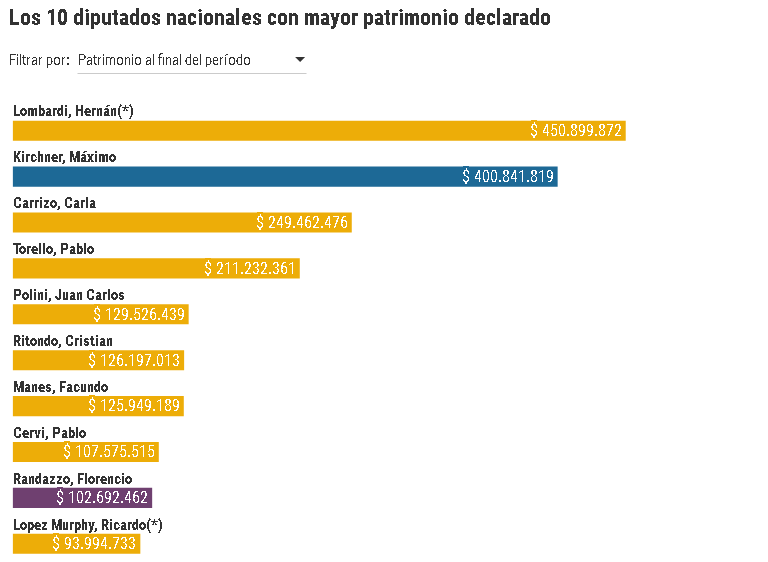 Aunque su riqueza quedó un paso atrás de los senadores nacionales, una decena de diputados informaron patrimonios superiores a los $100 millones. Algunos tienen años de funcionarios públicos, como los ex ministros Hernán Lombardi, Cristian Ritondo y Florencio Randazzo. Pero también hay un puñado de debutantes en el Congreso, todos procedentes del mundo privado, que quedaron entre los más ricos de la Cámara Baja, como el neurocientífico Facundo Manes, y los empresarios Juan Carlos Polini y Pablo Cervi, de Chaco y Neuquén, respectivamente.