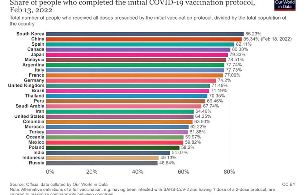 Al mirar en detalle el gráfico quedan al descubierto algunas falacias. La primera de ellas es que habla de “vacunados” cuando en lo que figura primera la Argentina, con el 88% de la población (igual porcentaje que España y China) es de personas que iniciaron el esquema de vacunación. Es decir, personas que tienen una sola dosis.