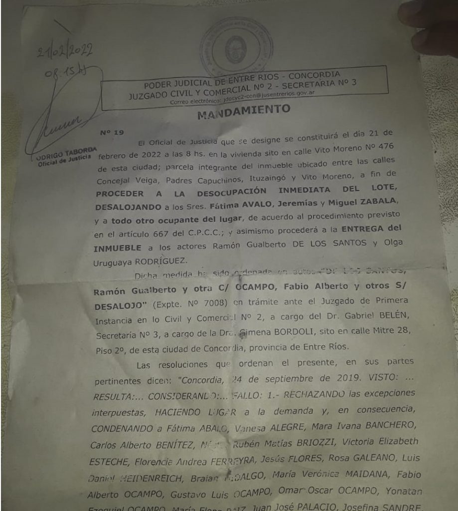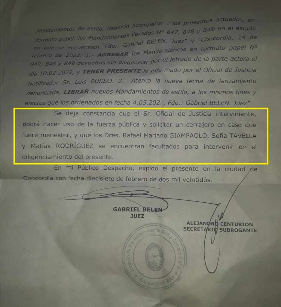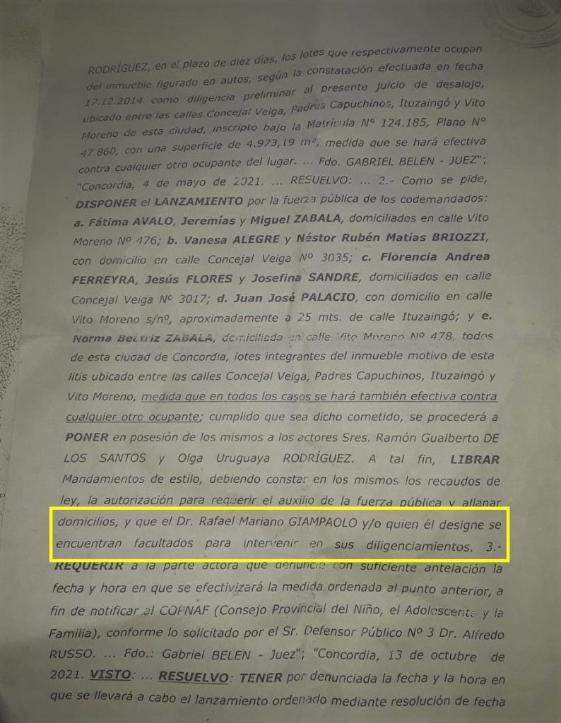 Afirma que no hace la procuración del caso y no fundamenta por qué apenas días atrás figuraba autorizado por el juez Gabriel Belén para intervenir en el desalojo. ¿Que más se le puede pedir al periodismo doctor? Habló con la persona carente de recursos y víctima de un desalojo violento, publicó videos y fotos que usted no desmintió para nada, y además tenemos el mandamiento y la constancia del terreno, que para refrescarle la memoria a usted, aquí publicamos.