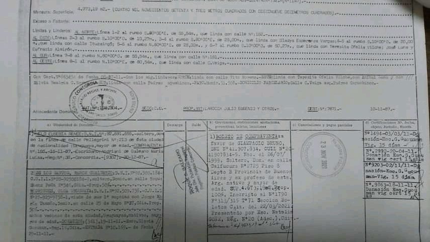 Hablando de claridad, no aclara en su extenso escrito ni una sola palabra respecto del dato periodístico y socialmente relevante para el caso: que su hijo Bruno de un poco más de 20 años y que vive en Buenos Aires aparece como dueño de un terreno involucrado en el asunto. ¿Cómo llegó el joven Giampaolo a inscribir el Boleto de Compra Venta de ese terreno doctor?. No dice. Eso es lo que queremos saber. No por ningún interés inconfesable: Simplemente porque Fátima lo dijo y aportó la documentación. Tampoco explicó por qué el mandamiento figuraba De Los Santos y en el dominio Bruno.