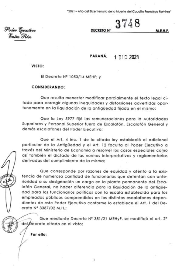 Lo permiten dos decretos el 3748 del 1 de diciembre de 2021 (que adjuntamos a la publicación) y el 381/21, que desapareció de la vista del público sin dejar rastros. Los aumentos recaen como se puede leer en el 3748 art. 1, sobre el sueldo básico, Gastos de representación y Compensación remunerativa (códigos 001, 003 y 008).