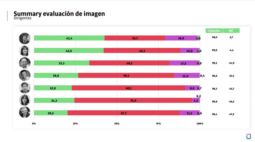 En la medición de políticos, la encuesta dio a Milei como el referente con mayor imagen positiva, alcanzando el 42,4%, seguido por Bullrich con el 42%, aunque la ex ministra también tiene números negativos del 46,3%. De todos modos, Cristina Kirchner se posiciona primera en imagen negativa con el 70,9%, seguida por Axel Kicillof con el 68,5% y Alberto Fernández con el 67,7%.