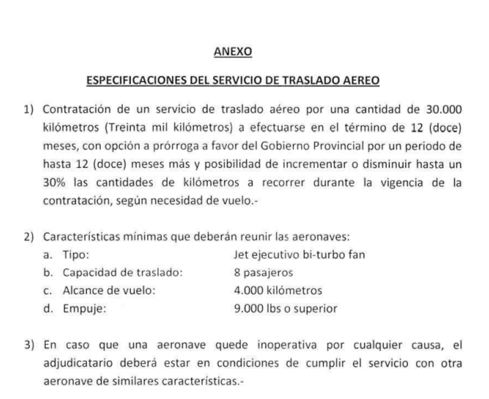 Quizás por este último motivo, el gobernador Bordet decidió contratar una aeronave para poder recorrer la provincia y pasear por el país. Siempre pagado con fondos públicos, por supuesto, decidió solicitar un servicio aéreo para él y los funcionarios que pueda designar.