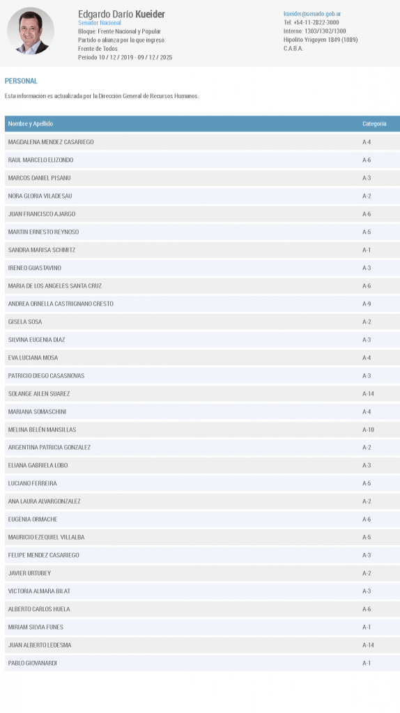Kueider, quien asumió en 2019 y hoy es parte del bloque Frente Nacional y Popular, cuenta con 30 empleados (13 permanentes y 17 transitorios), pese a que solo integra hasta ahora cuatro comisiones como vocal, si bien aún no terminaron de constituirse la totalidad.