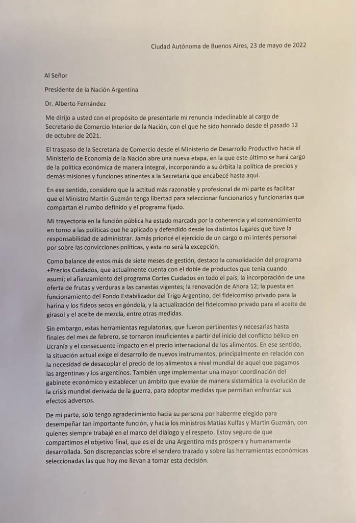“He presentado mi renuncia al cargo de Secretario de Comercio Interior. Agradezco al Presidente Alberto Fernández”, escribió en Twitter, y agregó: “Por la confianza, y a los ministros Matías Kulfas y Martín Guzmán por su trato siempre profesional y respetuoso. Les dejo la carta en la que fundamento la decisión tomada”.