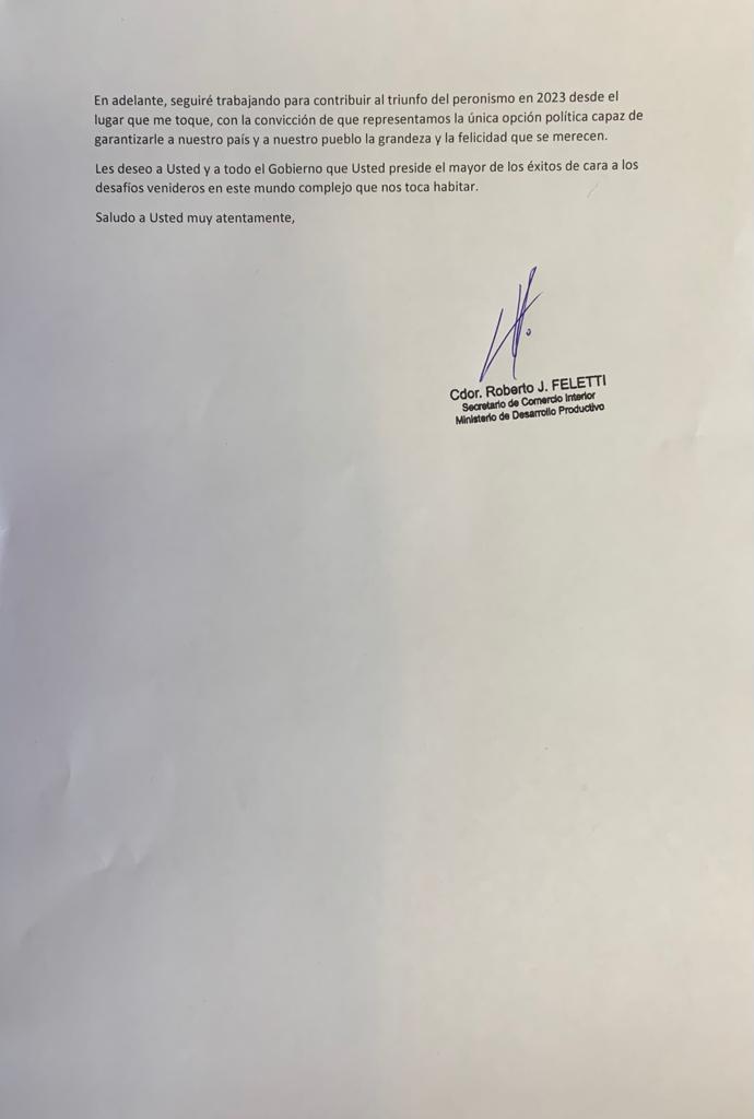 “Mi trayectoria en la función pública ha estado marcada por la coherencia y el convencimiento en torno a las políticas que he aplicado y defendido desde los distintos lugares que tuve la responsabilidad de administrar. Jamás prioricé el ejercicio de un cargo o mi interés personal por sobre las convicciones políticas, y esta no será la excepción”, agregó Feletti, que recordó varias de las medidas impulsadas, entre ellas, la “consolidación” del programa +Precios Cuidados, los Cortes Cuidados, la renovación de Ahora 12, la canasta de frutas y verduras, la puesta en funcionamiento del Fondo Estabilizador del del Trigo Argentino, del fideicomiso privado para la harina y los fideos secos, y la renovación de aquel para el aceite.