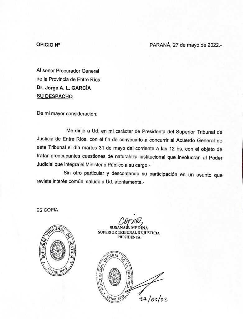 En un Oficio fechado este viernes 27 de mayo, la presidenta del Superior Tribunal de Justiciade Entre Ríos convocó al Dr. Jorge García, Procurador General de la Provincia, a la próxima reunión de Acuerdo del Tribunal, el martes 31 de mayo.