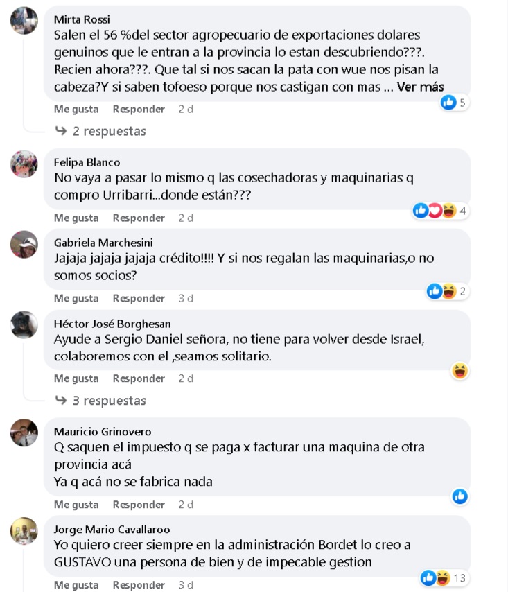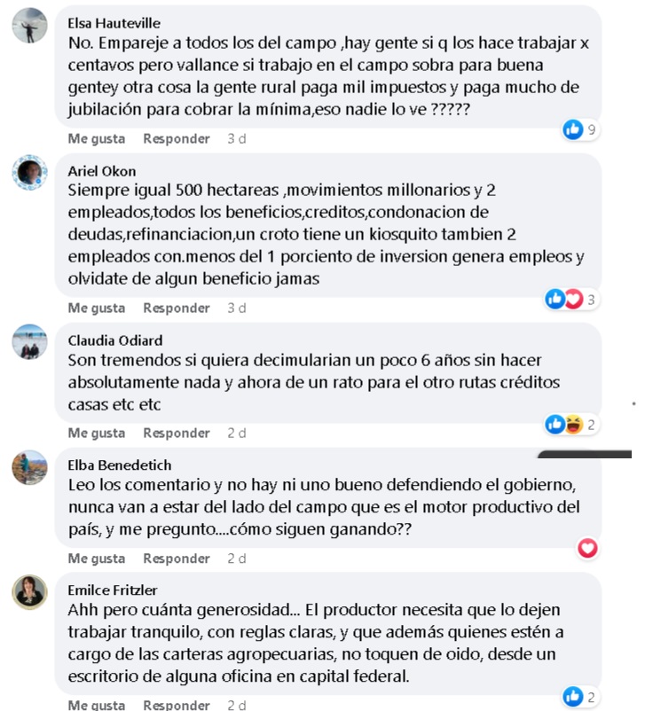 Lo relevante de la publlicación es la cantidad de mensajes de repudio a la gestión, casi 200 mensajes que no son favorables, ni siquiera neutrales. Mala noticia para el gobierno, que gasta millones de pesos para mantener la «buena imagen», aumentando la pauta publicitaria a casi el doble y doblando el presupuesto para funcionamiento en Comunicación, armando equipos para controlar y manejar las redes sociales, con ejércitos de «community managers». Millones que podrían ayudar a productores que no tienen acceso al crédito para comprar un tractor barato.
