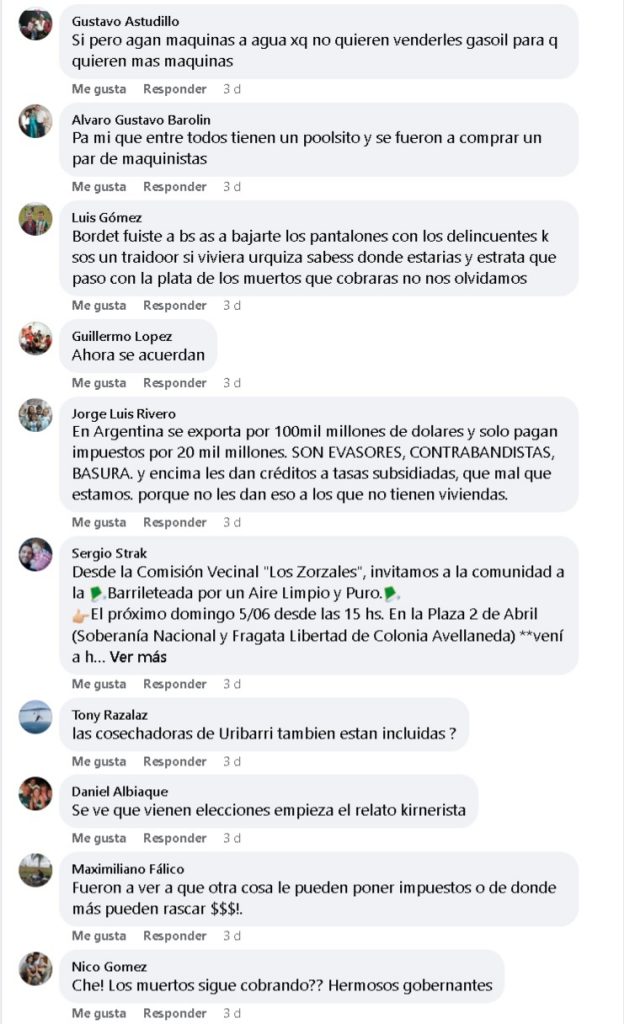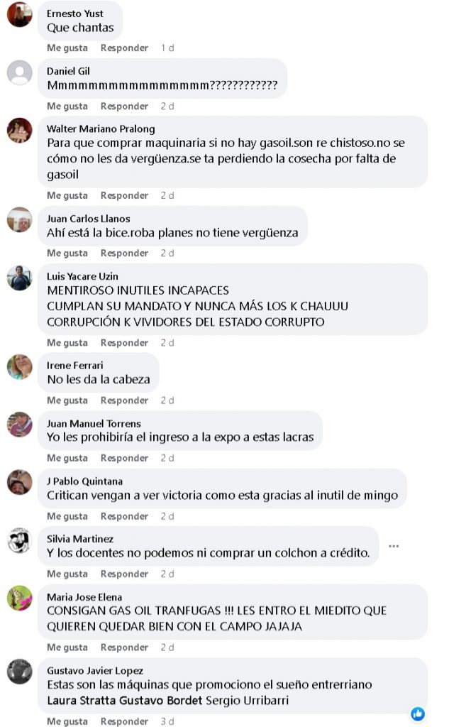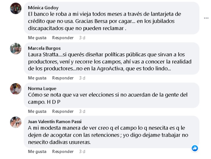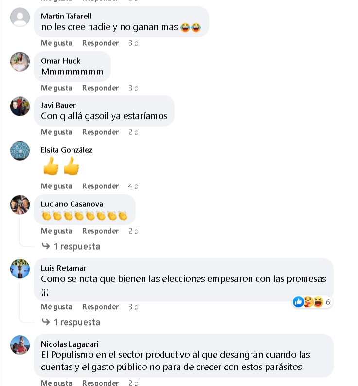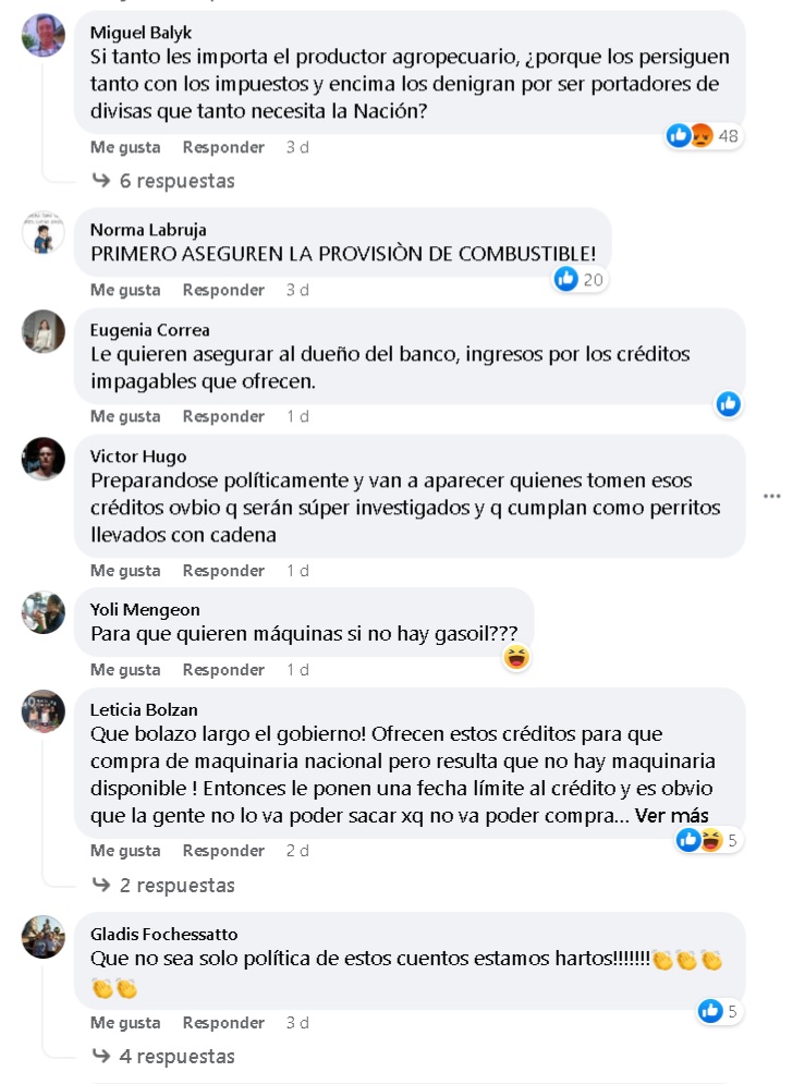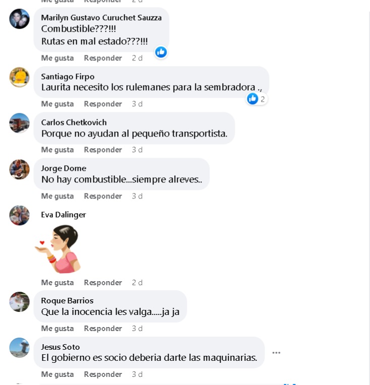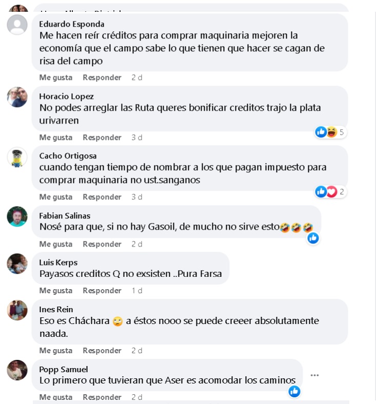 Lo relevante de la publlicación es la cantidad de mensajes de repudio a la gestión, casi 200 mensajes que no son favorables, ni siquiera neutrales. Mala noticia para el gobierno, que gasta millones de pesos para mantener la «buena imagen», aumentando la pauta publicitaria a casi el doble y doblando el presupuesto para funcionamiento en Comunicación, armando equipos para controlar y manejar las redes sociales, con ejércitos de «community managers». Millones que podrían ayudar a productores que no tienen acceso al crédito para comprar un tractor barato.