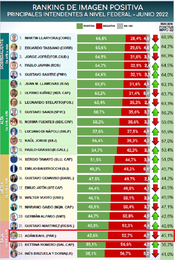 El informe deja al intendente Bahl en el 22º lugar de la tabla realizada entre 24 diferentes presidentes municipales del país, y pone de manifiesto que más de la mitad de los encuestados tiene una imagen negativa del intendente de Paraná, 52,7%, en el mes de junio.