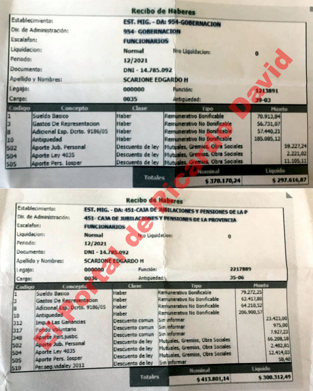 ¿No me crees?. En exclusiva te mostramos ambos recibos… Esperando que el Contador Edgardo Scarione aclare como Subsecretario en la Gobernación, o como Presidente de la Caja de Jubilaciones, con la muda de ropa que él elija.