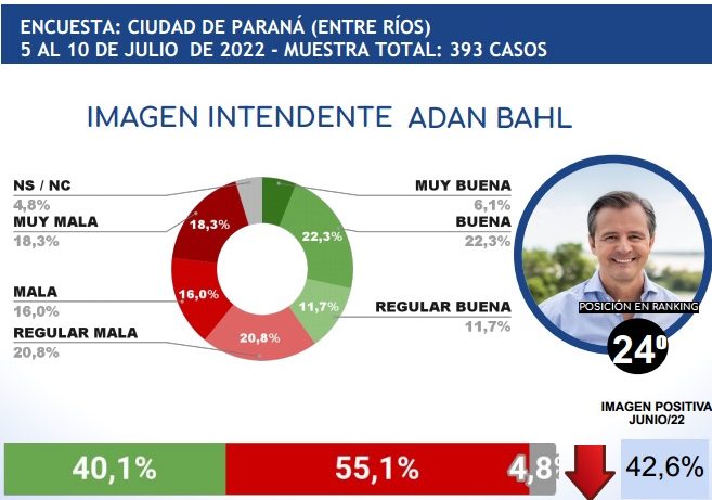 Un sondeo de opinión realizado por la Consultora CB revela que en el ranking de imagen positiva de intendentes de las 24 principales ciudades del país, el intendente Adán Bahl, que va por su reelección, genera el rechazo de más de la mitad de los paranaenses.