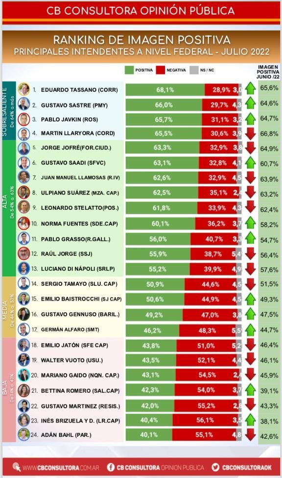 El informe deja al intendente Bahl último en la tabla de intendentes del país, con un incremento constante de la desaprobación de la gestión. Recordemos que en mayo ocupó el puesto 19 con 50,1% de imagen negativa, en junio creció si imagen negativa al 52,7% pasando al puesto 22 de 24.