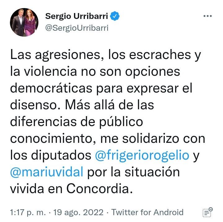Eso sí, el que se solidarizó con Rogelio fue Sergio Urribarri, por no compartir los métodos. Seguramente esperando una devolución de solidaridad ante los escraches que viene padeciendo.