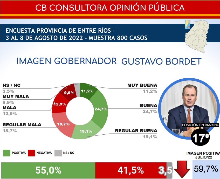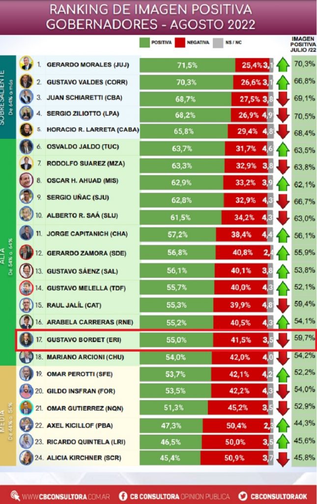 Ni las encuestadoras amigas lo salvan. En el fondo de la tabla, cómodo, hace la plancha Gustavo Bordet. Bien lejos del podio que comanda el Radical Morales de Jujuy, seguido por Gustavo Valdes de Corrientes y el peronista Juan Schiaretti de Cordoba (71,5; 70,3 y 68,7% respectivamente).