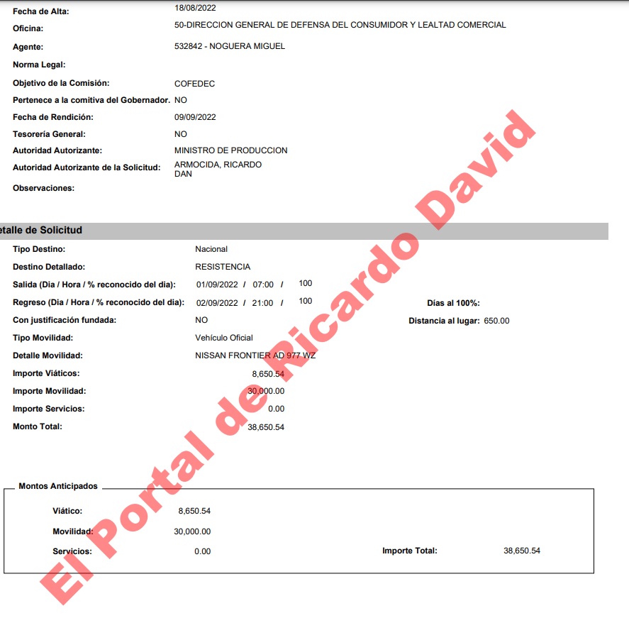 Lo que surge del parte de solicitud de viáticos para realizar el viaje a Chaco es que la comisi{on solo debía durar hasta las 21hs del viernes y el accidente ocurrió a las 11 de la mañana del sábado. Y el segundo dato llamativo es que fue autorizada una camioneta Nissan Frontier AD977WZ y no la Duster.