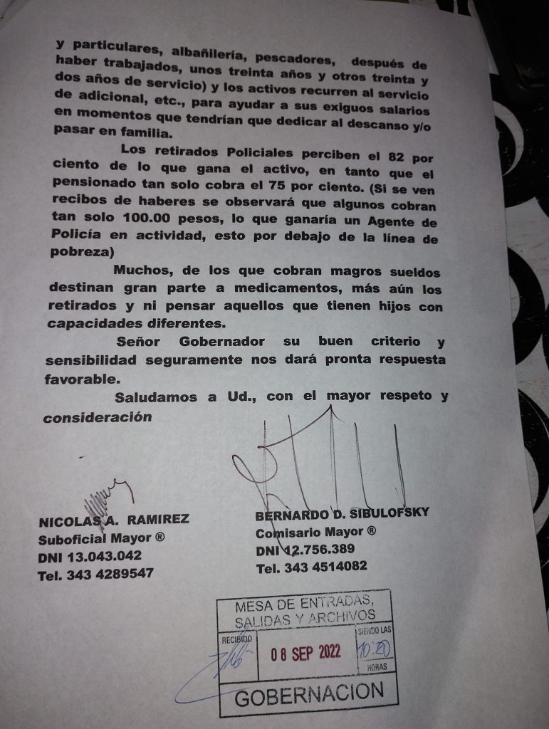 «Según dicen, los policía está dentro de las siete mejores remuneradas del país, pero si es así esto debería reflejarse en el retirado y pensionados que dejan de percibir adicionales y no llegan al 75% del sueldo, no llegan al 82% que dice la ley. Toda una vida dedicada a nada.