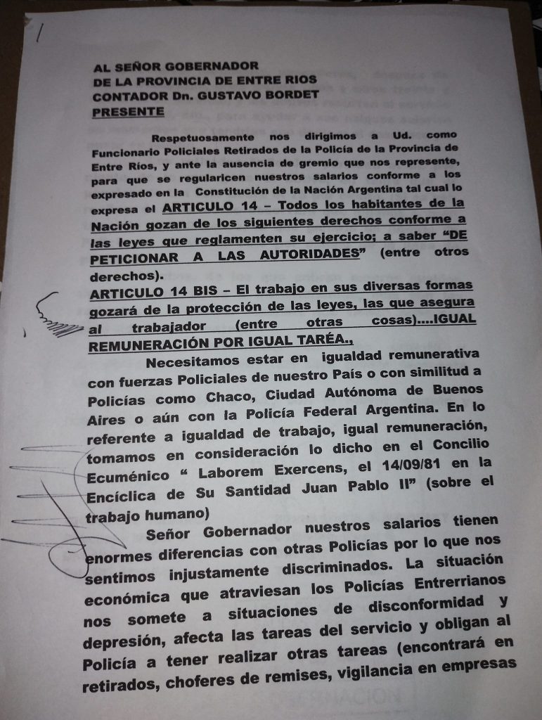«La situación de los activos preocupante, porque lo que el funcionario está ganando respecto a las horas de prestación de trabajo no alcanza. Teniendo en cuenta que muchos deben pagar niñeras para poder ir a trabajar y para cumplir con la cantidad de horas. Y nosotros los retirados, muchos estamos en una edad en que el sueldo se va mucho en la farmacia, o porque debemos ayudar a nuestros hijos o nietos. Por este motivo hemos hecho un reclamo salarial ante el gobernador pidiendo equiparación con la Policía Federal Argentina, con la Policía de Chaco, que ganan muy bien, o con la policía de la ciudad de Buenos Aires».