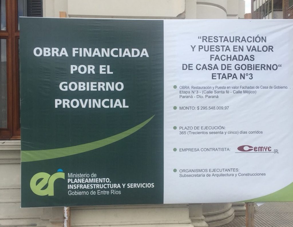 El nivel de obscenidad que tiene el cartel que anuncia la obra de “Restauración y Puesta en Valor de Fachadas de Casa de Gobierno» es superlativo. Con fondos provinciales, léase de todos los entrerrianos, se van a gastar (en principio) $ 295.548.009,97, lo que representa casi 300 millones de pesos del Estado.