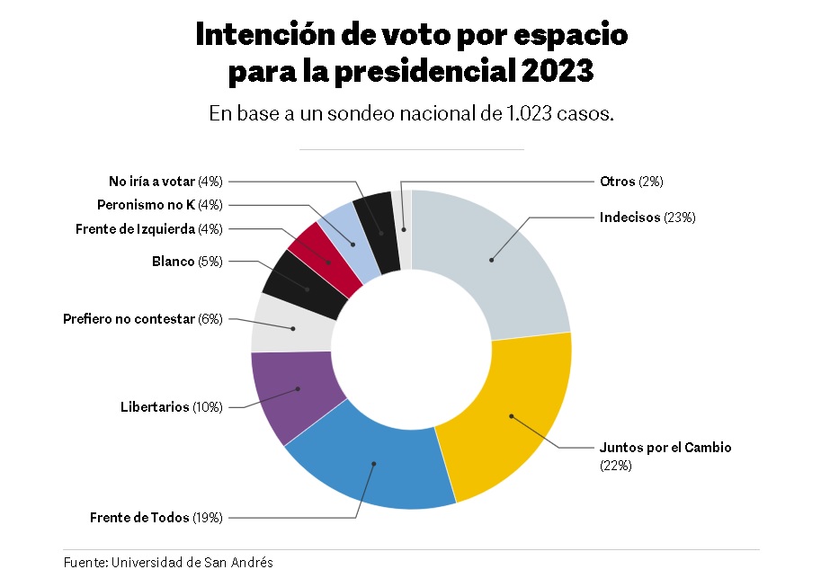 La foto de noviembre deja a los indecisos arriba, con 23%. Pegados vienen Juntos por el Cambio (22%) y el Frente de Todos (19%). En dos dígitos, aunque claramente más abajo, se anotan los libertarios (10%).