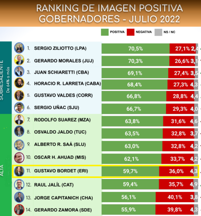 A principios de este año, la misma consultora ponía al gobernador entrerriano en una buena posición con una buena imagen que superaba ampliamente el 60%, entre los gobernadores con mejor imagen, algo que no se asociaba a lo que ocurrió en las últimas elecciones legislativas. Nunca se supo en qué consistía esa “imagen positiva”, porque la lista que apoyó en ese momento Bordet en la provincia de Entre Ríos perdió como por paliza.