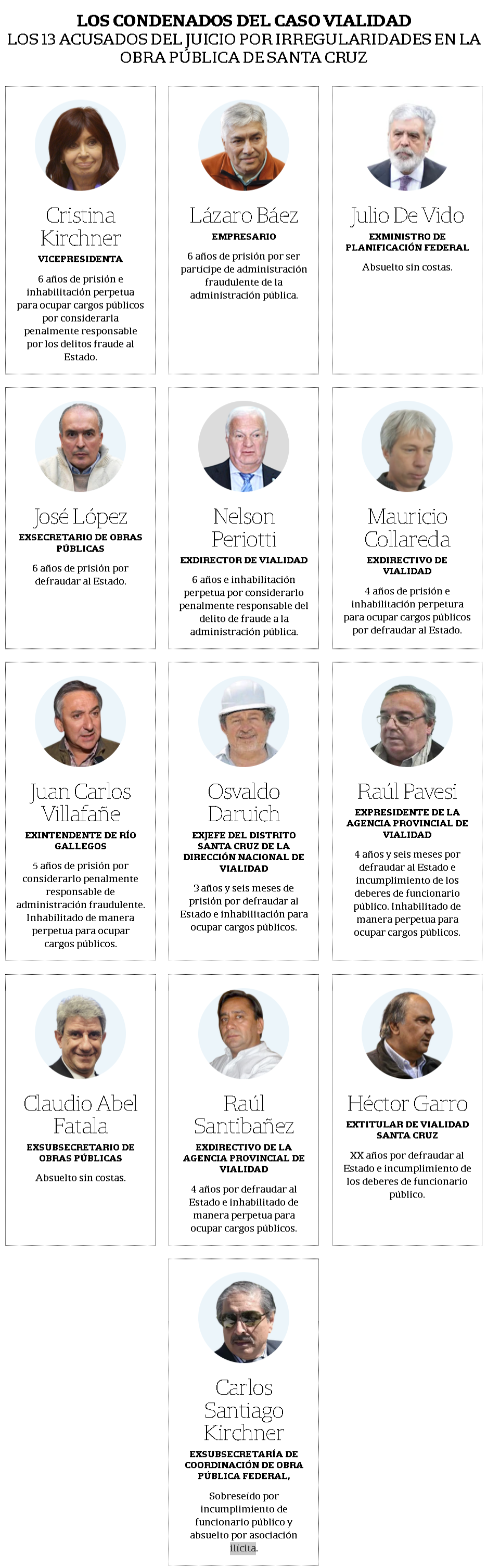 Además de Cristina Kirchner fueron condenados a seis años de prisión por fraude el exsecretario de Obras Públicas José López; el extitular de la Dirección Vialidad Nacional Nelson Periotti, y Lázaro Báez, dentro de un lote total de 13 imputados. El exministro de Planificación Federal y exdiputado Julio De Vido fue absuelto de todos los cargos.
