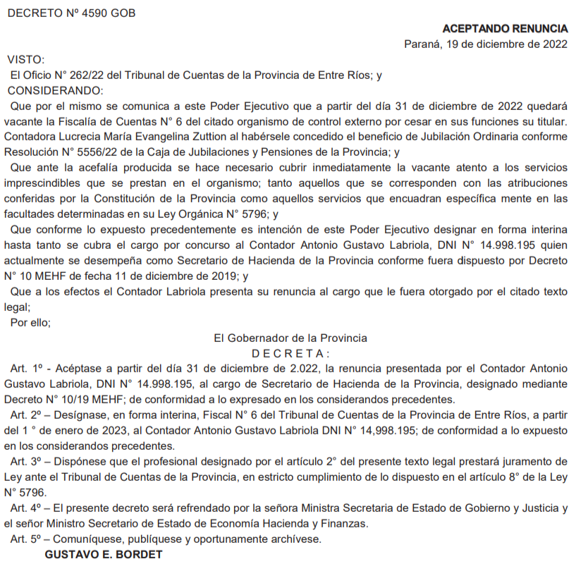 En esto de acomodar familiares y amigos, no podía ser de otra manera, Bordet hace renunciar a su SECRETARIO DE HACIENDA, el contador concordiense Antonio Labriola, para designarlo como FISCAL DE CUENTAS N° 6 DEL TDC de la provincia.