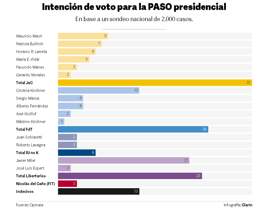Luego viene el cuadro más interesante, con los números para las PASO. Allí, se confirma una ventaja de JxC sobre el FdT en el total: 31% a 24%. Pero quizá el dato más fuerte sea el empate técnico entre el oficialismo y los libertarios, que llegan a 23%.