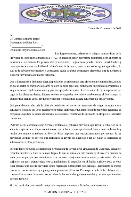 Se trata de un documento para solicitar medidas de alivio debido al impacto que sufre por la sequía y la caída de producción agrícola-ganadera en la provincia y la región, de las principales fuentes laborales de los transportistas