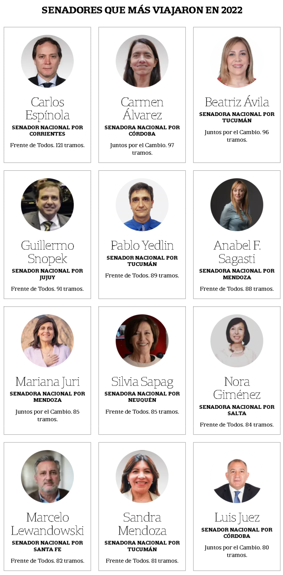 Los legisladores que más viajaron en 2022, con hasta más de 120 tramos a lo largo del año, fueron Carlos Espínola (121), Carmen Álvarez (97), Beatriz Ávila (96), Guillermo Snopek (91), Pablo Yedlin (89), Anabel Fernández Sagasti (88), Mariana Juri y Silvia Sapag (85), Nora Giménez (84), Marcelo Lewandowski (82), Sandra Mendoza (81) y Luis Juez (80).